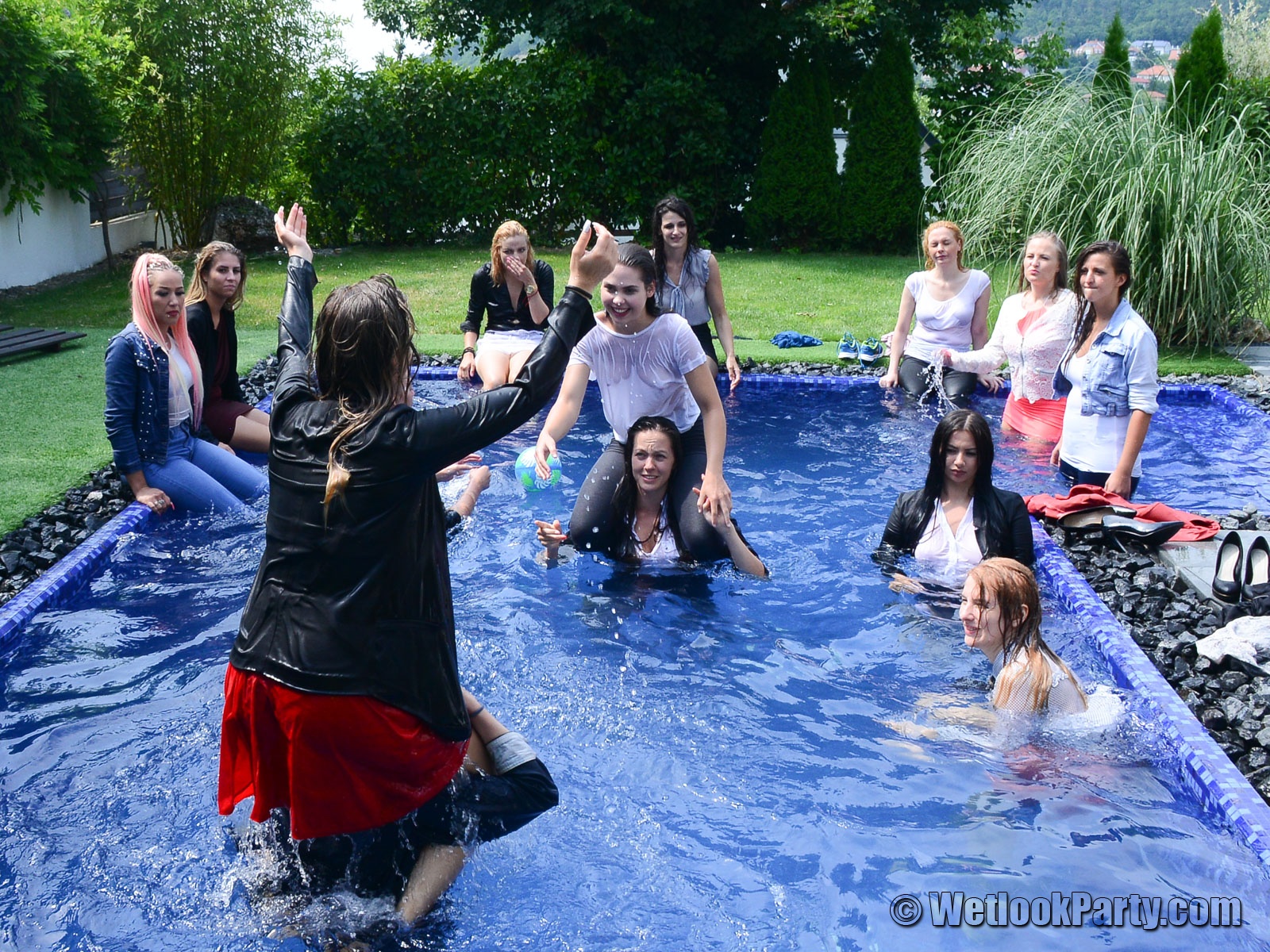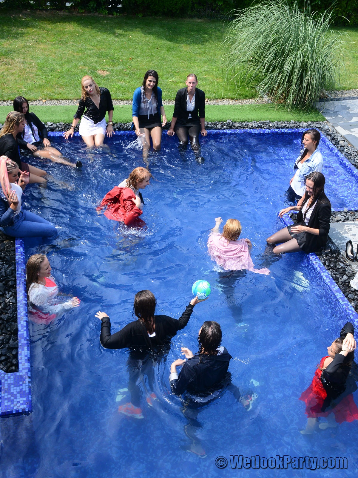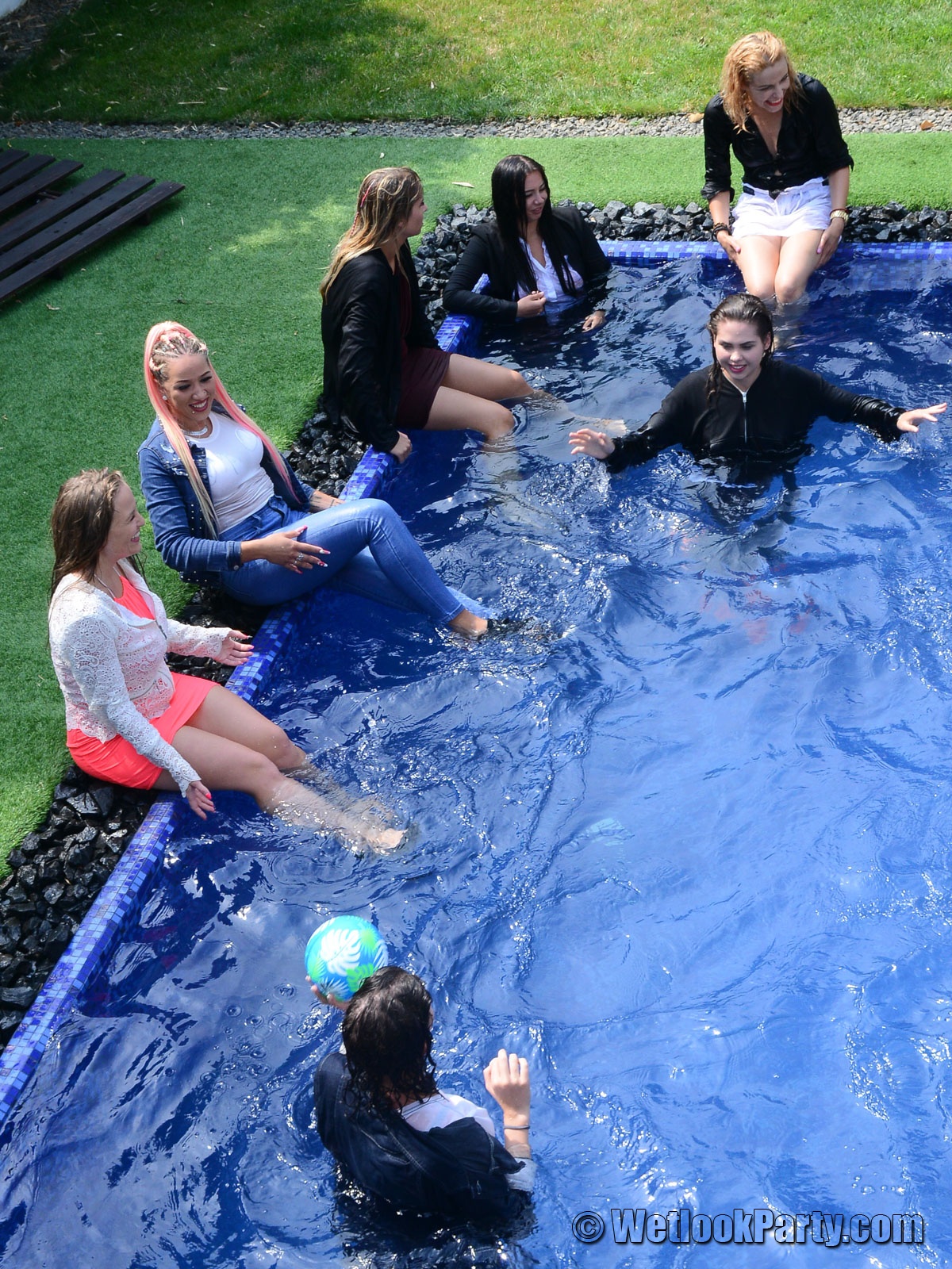 In part three of Wetlook Party 53, the crew decided to stop giving instructions and allowed the girls to have the freedom to enjoy themselves, as long as they stayed wet. A ball, a mattress, and good music contributed to the lively atmosphere.